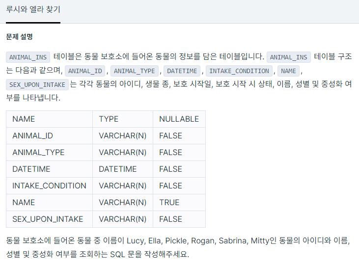 WHERE NAME IN ('Lucy', 'Ella', 'Pickle', 'Rogan', 'Sabrina', 'Mitty')