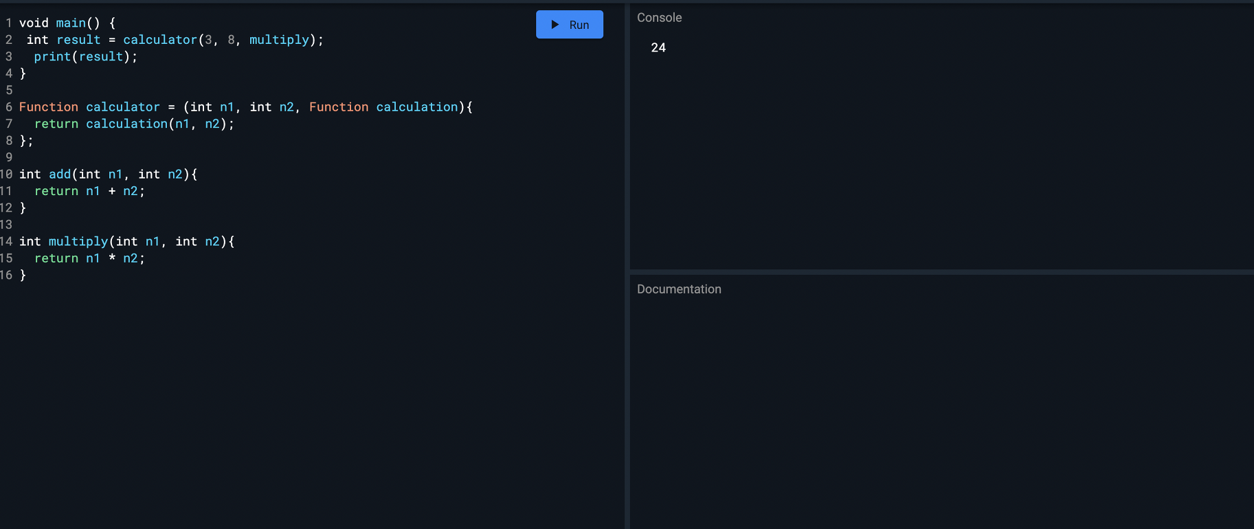 int result = calculator(3, 8, multiply);