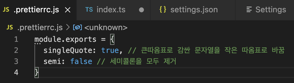 singleQuote: true, // 큰따옴표로 감싼 문자열을 작은 따옴표로 바꿈